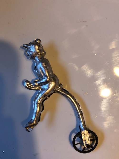 After making sure I had taken note of his original colours (which there were tiny traces of here and there), I re-gilded him with silver. Originally, these toys may have been cast then strayed, but I felt it would be a good match to use silver leaf and powders.