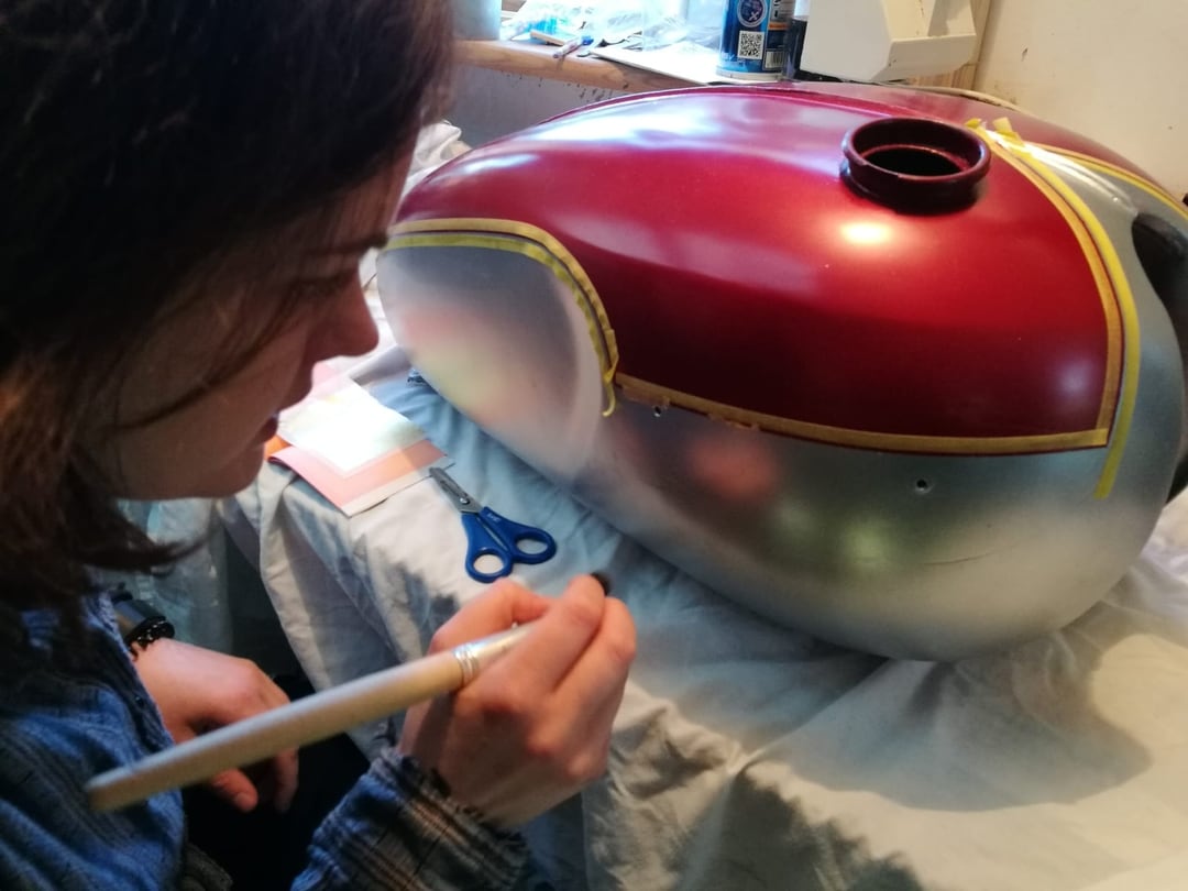 This 1968 Triumph Bonneville tank needed a bit of a makeover, and the client requested that I re-gild the gold lines around the tank. I used 23.5 carat gold and sealed the tank with lacquer to keep the gold protected against all weathers!