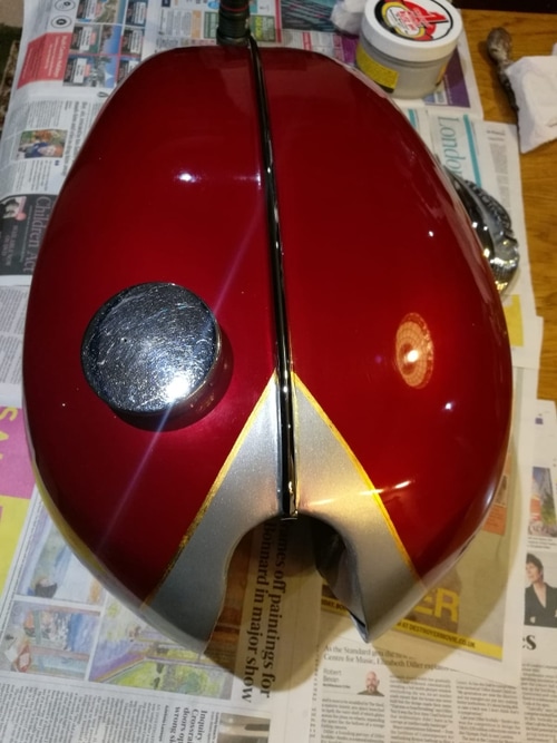 23.5 carat gold leaf gilded lining on 1968 Triumph Bonneville tank, sealed and lacquered.